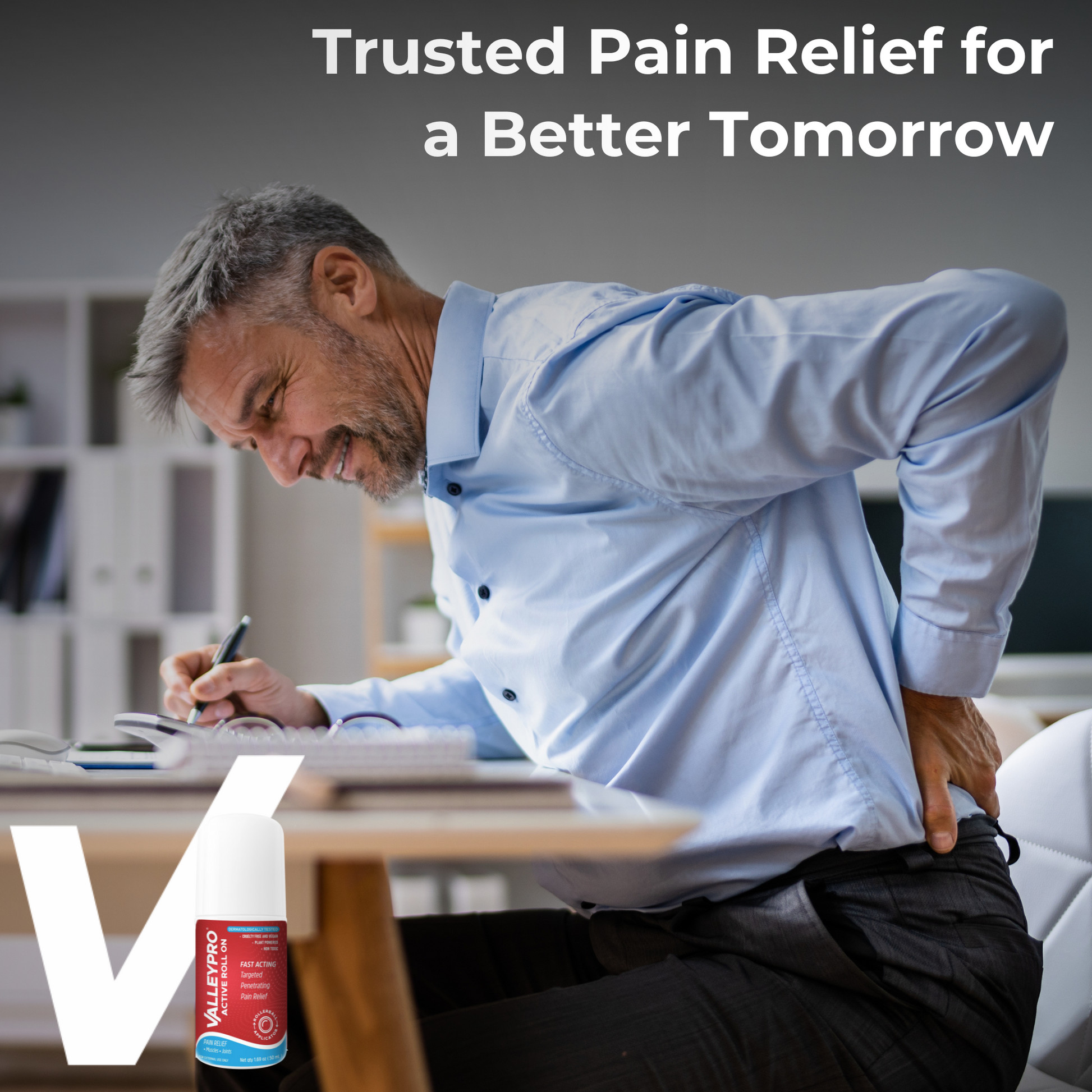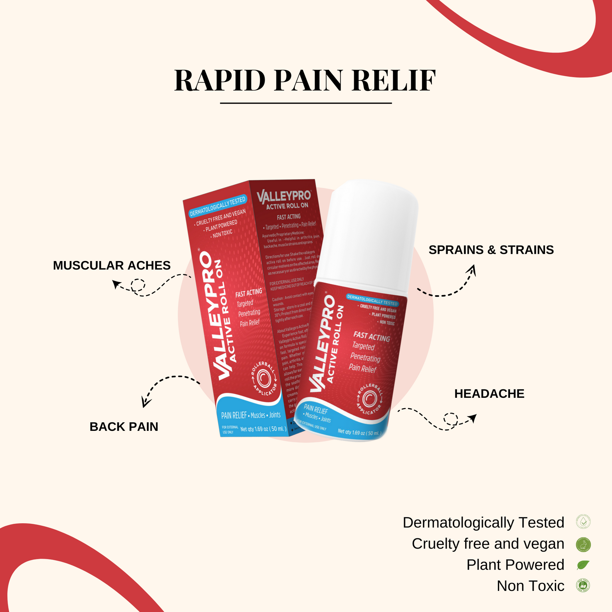 VALLEYPRO ACTIVE ROLL ON IS HELPFUL IN BACK PAIN, ARTHRITIS, OR SPORTS INJURIES, THIS ROLL ON CAN HELP. WHICH MAKES IT SUITABLE FOR REGULAR USE. IT IS ALSO DERMATOLOGICALLY TESTED.